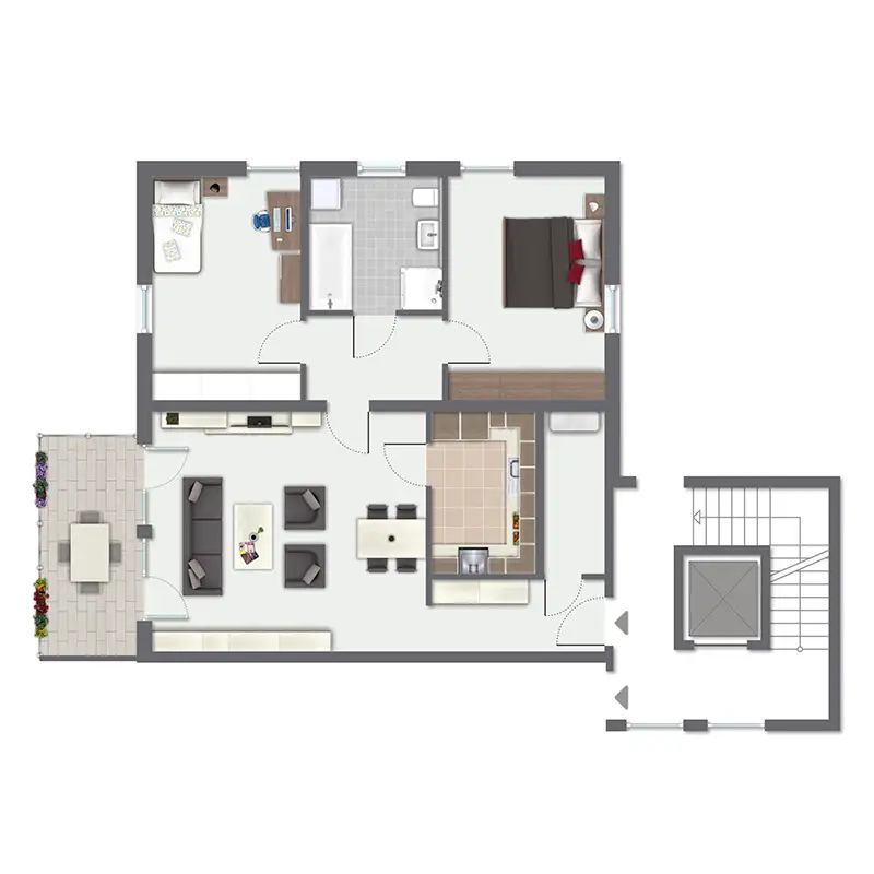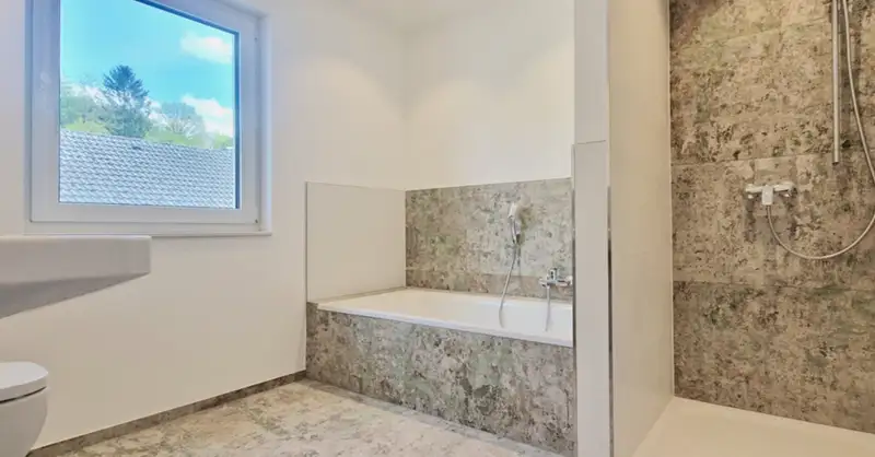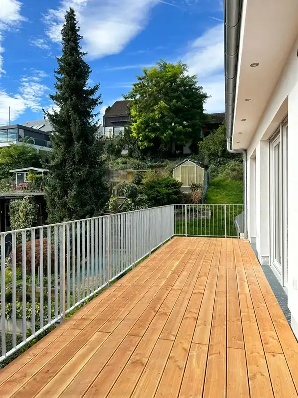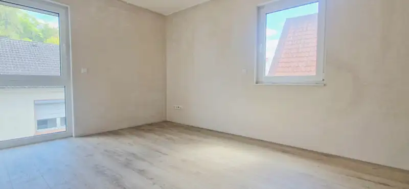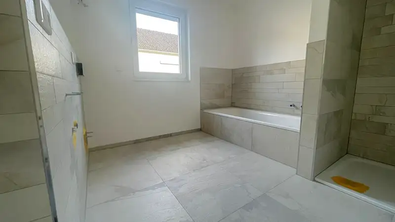 Unsere 3-Zimmer-Wohnung befindet sich im 1. Obergeschoss eines modernen Mehrfamilienhauses, welches aus 5 Wohneinheiten besteht. Sie verfügt über eine Küche, einen großzügigen Wohn-Essbereich und ein Tageslichtbad mit Dusche und Badewanne. Das Highlight der Wohnung ist der angeschlossene große Süd-West-Balkon. Zu jeder Wohnung sind 2 PKW-Stellplätze vorgesehen, wahlweise kann dieser als Außenstellplatz oder Offener-Garagenstellplatz erworben werden. Die offenen Garagenstellplätze befinden sich in einer separaten Etage im Erdgeschoss unter den Wohnungen.