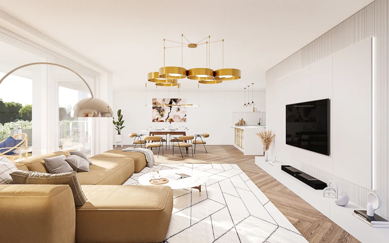 Das Highlight der Wohnung ist der offen gestaltete Wohn- und Essbereich mit integrierter Küche – hier verschmelzen Kochen, Essen und Entspannen zu einem zentralen Lebensraum. Von hier aus betreten Sie den über 21 m² große, teilweise überdachten Balkon, der zum Verweilen im Freien einlädt.