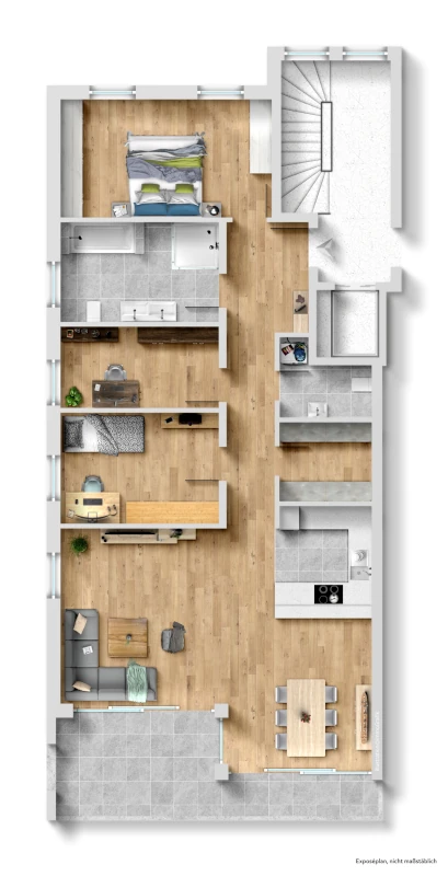 Die Wohnung verfügt über ein geräumiges Schlafzimmer, ein Kinderzimmer, ein separates Arbeitszimmer – ideal für Homeoffice sowie eine praktische Abestellkammer. Ein großzügiges Badezimmer mit Wanne und Dusche sowie ein separates Gäste-WC sorgen für zusätzlichen Komfort.