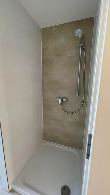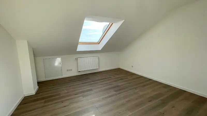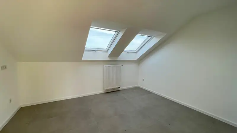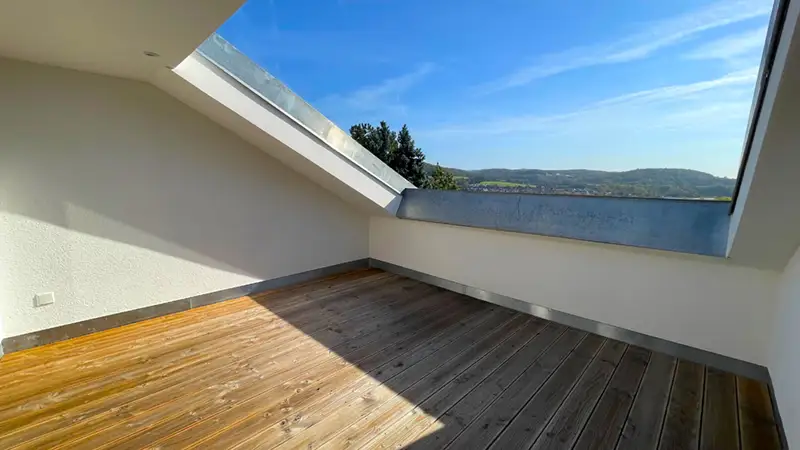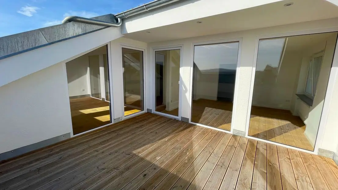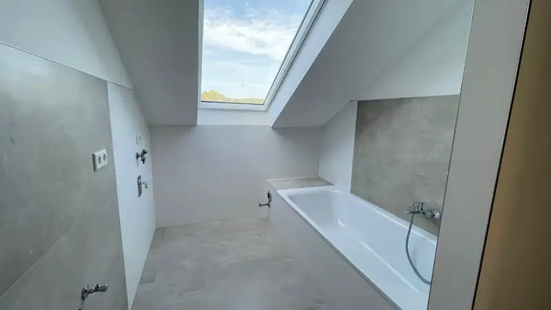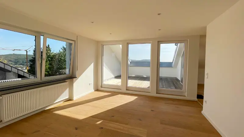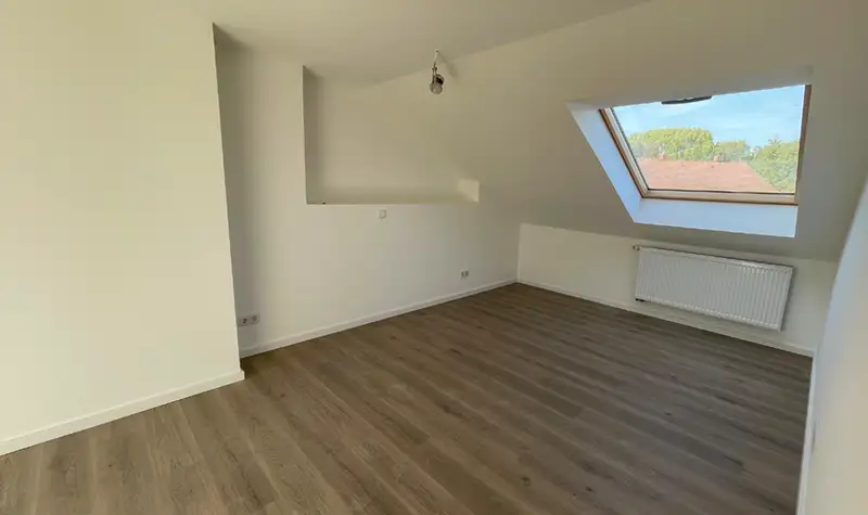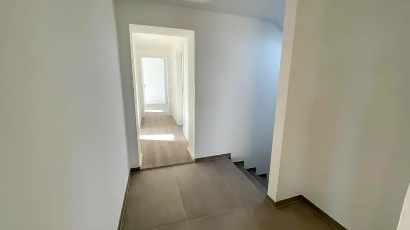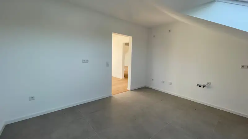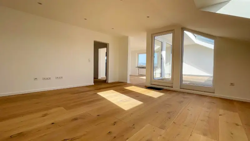 Durch die großflächigen Fenster der Loggia wird das Wohnzimmer tagsüber mit natürlichem Licht erhellt und lässt den Wohnraum noch viel größer wirken. Der Boden in den Wohnräumen und im Flur ist mit Eichen-Echtholzparkett verlegt, während das Bad, Treppe, Flur und Küche mit hochwertigen, großformatigen Feinsteinfliesen ausgestattet sind. Alle Malerarbeiten und Tapezierarbeiten mit Malervlies sind bereits abgeschlossen.