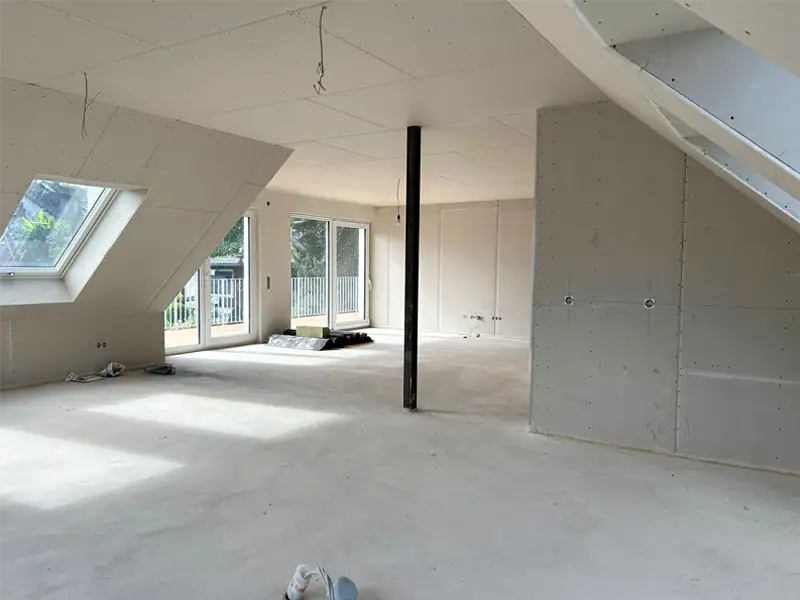 Die Dachgeschosswohnung im 3. OG verfügt über 3 Schlafzimmer, eine Ankleide, eine Küche sowie einen großzügigen Wohn-Essbereich, ein Badezimmer mit Dusche und Wanne sowie eine Gästetoilette.